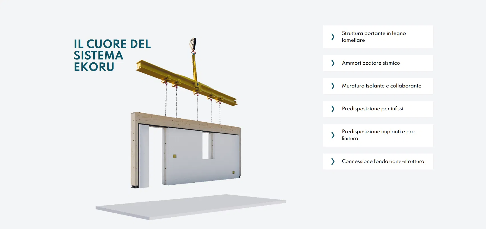 ELEMENTI COSTRUTTIVI A TECNOLOGIA INTEGRATAIl sistema costruttivo Ekoru si basa su singoli elementi "finiti" realizzati su misura in fabbrica con tecnologie brevettate, pronti per essere assemblati in cantiere. Sono costituiti da strutture portanti in legno e vere murature monolitiche, resistenti al fuoco e che non necessitano di ulteriore isolamento. Integrano soluzioni uniche come le predisposizioni impiantistiche e gli strati ammortizzanti che rendono l’edificio più sicuro in caso di sisma. La struttura è stata infatti testata dall’Università Federico II e, anche se sottoposta a notevoli forze, si è dimostrata capace di assorbire e dissipare l'energia in modo uniforme mantenendo integrità, simmetria e stabilità.